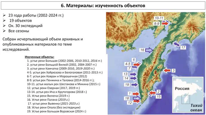 A distinctive feature of Kamchatka’s estuaries is their exceptionally high spatial and temporal variability of all hydrological characteristics compared to the open sea. The dominant controlling factors include river discharge, tidal forcing, and coastal morphodynamics. In Kamchatka, these factors combine in various proportions, giving rise to several types of tidal estuaries, each with its own hydrological and morphological structure.